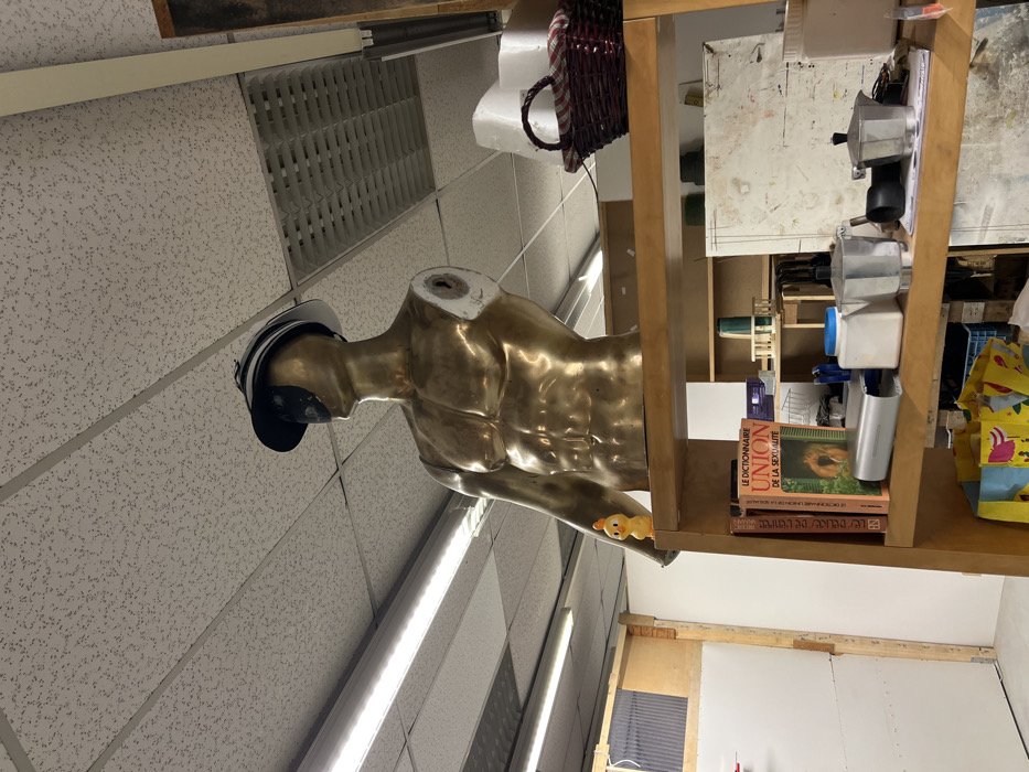 A headless golden male torso wearing a black hat stands beneath a ceiling with vent and fluorescent lighting. Beside the mannequin is a wooden shelving unit stocked with books, including "Le Dictionnaire Union de la Sexualite", storage containers, and coffee makers. A yellow rubber ducky clings to the edge of the mannequin. The room's background includes visible sections of a white wall, window, and wooden beam.