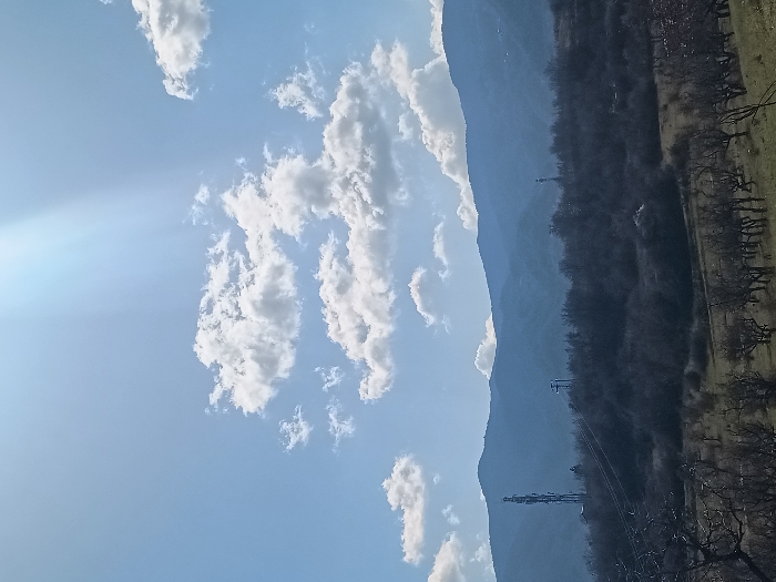 The scene depicts a panoramic landscape view located in the city of Goce Delcev, Bulgaria, under bright daylight with a partly cloudy sky. The upper two-thirds of the image display a clear, light blue sky populated by scattered white cumulus clouds. Distinct sun rays emanate from the upper-center-left, extending downwards. The lower third of the image comprises a foreground field, predominantly green and brown, containing multiple rows of dormant, bare deciduous trees or shrubs, suggesting a late winter or early spring season. Behind this field, a dense, dark mass of bare trees and shrubs forms a low-lying hill or ridge. Elevated above this tree line on the left side, a tall, multi-tiered metallic lattice communication tower is visible. To the right of the tower, a smaller utility structure with horizontal power lines is also present. The background features a prominent range of hazy, dark blue-grey mountains stretching across the entire horizon. No individuals, specific actions, or interactions are discernible within the frame.