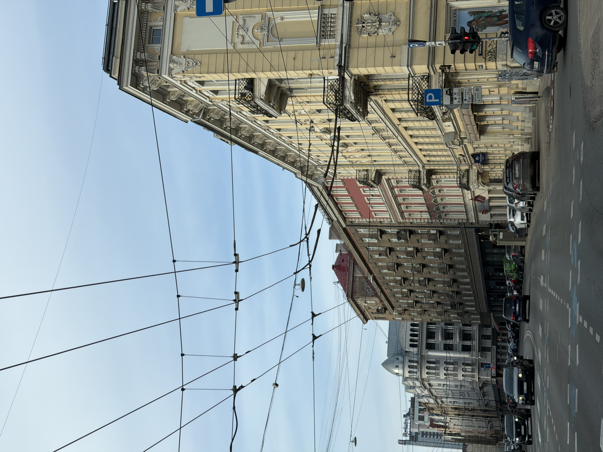 street in Riga, Latvia, looking down a roadway lined with multi-story buildings. The buildings are a mix of architectural styles, with ornate facades, balconies, and decorative elements. Traffic moves along the street, including cars and possibly buses. Wires crisscross the sky, likely for trams or trolleybuses. Blue parking signs are visible along the street. The sky is light blue and mostly clear.