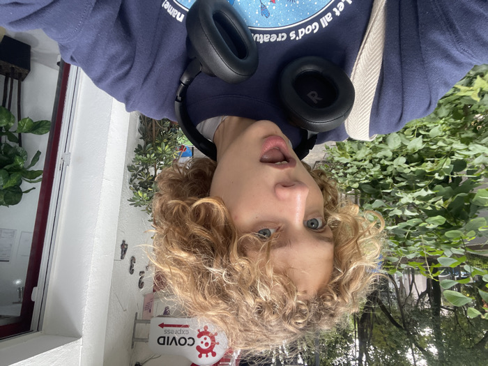 The image depicts a waist-up, candid self-portrait of a light-skinned individual with short, curly blonde hair and blue eyes, captured outdoors
