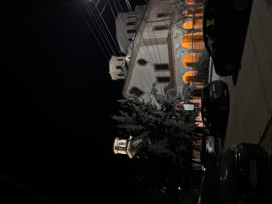 The image depicts a night scene on a paved street in the city of Pazardzhik, Bulgaria, specifically featuring the Dormition of the Theotokos Church