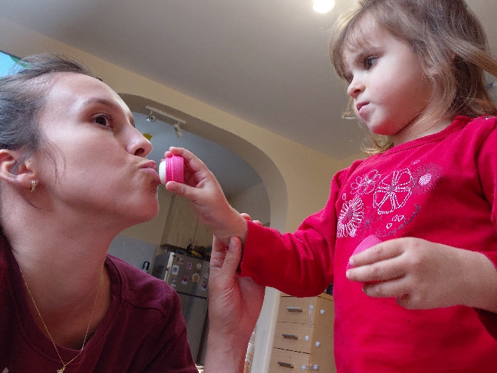 This image captures an indoor scene in Nova Zagora, Bulgaria, featuring two individuals: an adult female and a young female child. The adult female, positioned on the left, wears a dark red t-shirt, a gold-colored pendant necklace, and a small hoop earring in her visible left ear; her brown hair is pulled back, and her lips are pursed forward. The child, on the right, wears a bright red long-sleeved shirt with white floral or geometric patterns. In her right hand, the child holds a small, round, pink and white container, extending it towards the adult's mouth. The adult's left hand is observed holding the child's right wrist. The child's left hand holds an additional small pink object. The background consists of light-colored walls, a ceiling with a visible recessed light fixture, an arched doorway leading to an adjacent room, a partially visible kitchen area with a stainless steel refrigerator, and a light-toned chest of drawers with multiple small drawers. The environment is illuminated by artificial overhead lighting.