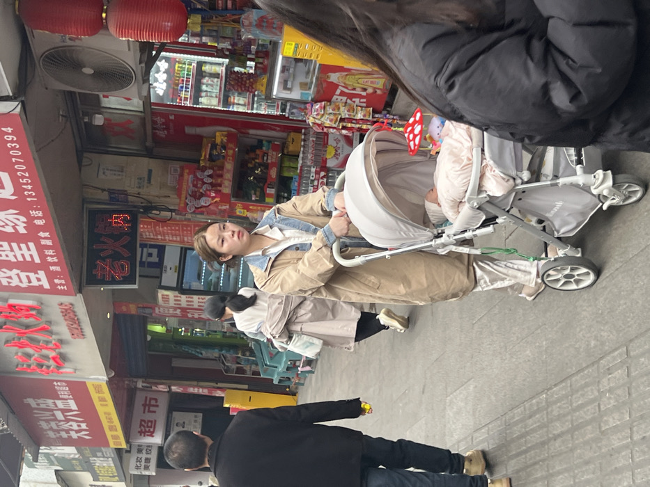 This image captures a pedestrian pathway in a commercial district of Jiangjin, China. In the center, a young adult female with light brown hair, wearing a beige trench coat over a denim jacket and light-colored satin pants, pushes a light gray baby stroller. A baby, covered with a pink blanket and wearing a white hat, lies within the stroller, from which a red and white mushroom-shaped toy is suspended. The female maintains a neutral expression, looking forward. To her left, an adult male in a black jacket and blue jeans walks away from the camera, holding a small yellow object in his right hand. Further into the scene, another adult female with dark hair, wearing a light-colored coat, also walks away. The right foreground shows the partial view of a person wearing a dark, puffy jacket. The background consists of multiple storefronts with prominent Chinese signage. Red signs display "吴六合堂" (Wu Liu He Tang) and "便利店" (Convenience Store). Another large red sign is for "红花火锅" (Red Flower Hotpot). Above, a sign reads "登圣缘" (Deng Sheng Yuan), advertising "酒水饮料副食" (alcoholic beverages, soft drinks, non-staple food) and a phone number (13452070394). A red LED sign displays the characters "老火锅" (Old Hotpot). Various merchandise, including drinks in a cooler and hanging packaged goods, are displayed outside the shops. Two red decorative lanterns are stacked vertically near the right edge of the frame. Two outdoor air conditioning units are mounted on the building wall above a storefront. The pathway is paved with gray rectangular tiles.