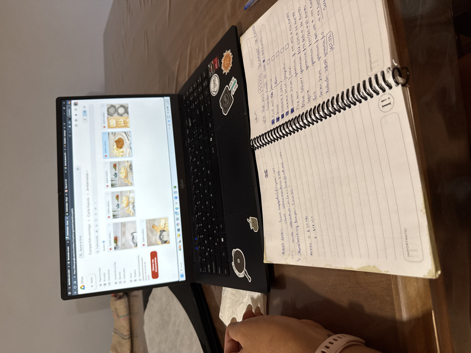 A laptop is open, displaying an image search on Google Drive for "Corta Huevos Ambientades." Next to the laptop is a spiral-bound notebook with handwritten notes in Spanish. One page lists "VOY POR Vos/11001 DICIEMBRE DE EXITO," followed by a checklist of items like "Cacerden fusión Cola," and a list of items like “disco sehore”, accompanied by prices and quantities. On the other page are reminders about "NUEVO GMAIL," followed by names and numbers. The words "IMPORTANTE" appear on both pages.