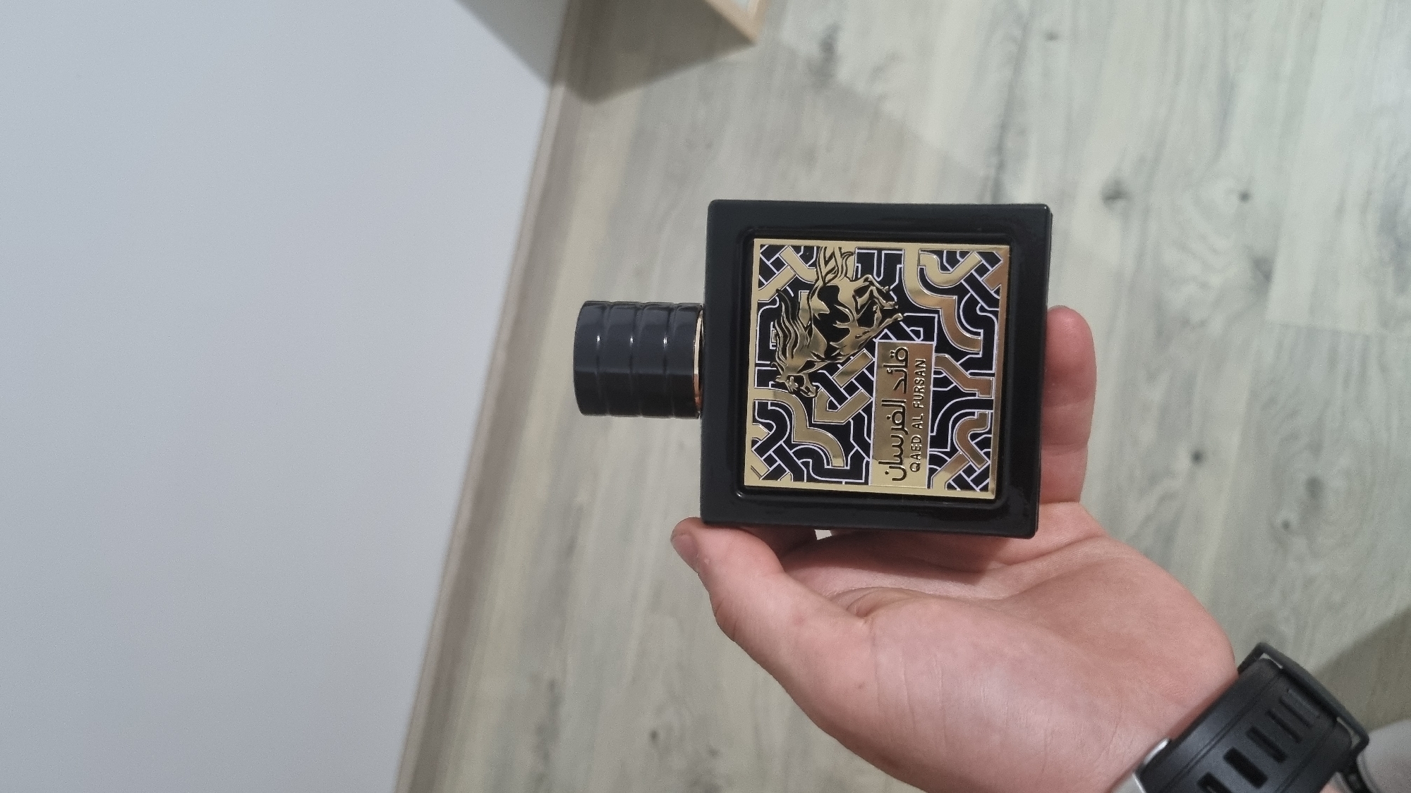 An indoor scene depicts a human hand holding a black rectangular bottle of "QAED AL FURSAN" perfume or cologne. The bottle features a gold and black label with Arabic script, the English text "QAED AL FURSAN," and a stylized golden horse illustration, all set against an intricate gold geometric pattern. The bottle is capped with a ridged black cap, accented by a gold band beneath. The hand, exhibiting fair skin, holds the bottle with fingers partially visible on the sides. A black digital watch or fitness tracker with a textured strap is visible on the wrist. The background consists of a plain light-grey wall in the upper half and a light-colored wooden floor with horizontal planks in the lower half. A thin, light-colored baseboard separates the wall and floor. A light-colored, indistinct object or box is partially visible on the floor against the wall in the far right of the frame. The precise location within the city of Pchelnik, Bulgaria, is not discernible from the visual evidence in the image.