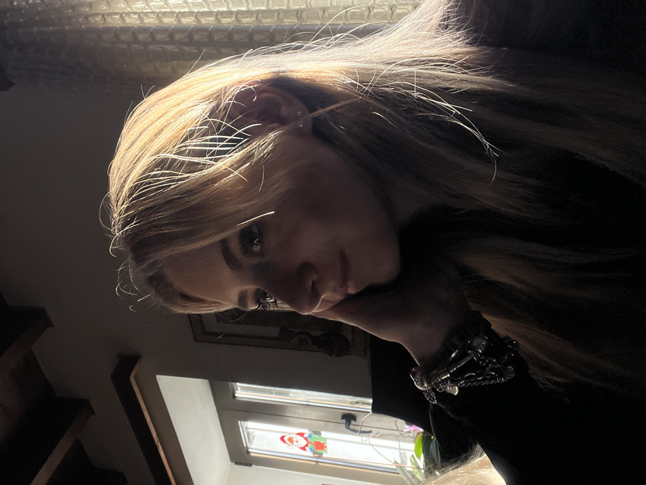 An interior scene in Santa Cruz de Bezana, Spain, features a female subject in a contemplative posture. The woman, shown in profile from the left shoulder up, has long blonde hair illuminated by strong sunlight from the right, creating a halo effect. Her left hand is positioned against her left cheek, with fingers extending towards her temple. She wears a dark, long-sleeved garment and multiple layered bracelets on her left wrist, some appearing metallic with charms. A small, simple stud earring is visible in her left ear. Her face is predominantly in shadow, though her eye, nose, and mouth contours are discernible. In the background to the left, a set of light-colored double doors or French windows is visible, adorned with a red Santa Claus decoration on the glass. Bright light streams through these windows, and hints of green foliage are present below them. Wooden ceiling beams are partially visible in the upper left. To the right, a textured, light-colored curtain or patterned screen is brightly lit by direct sunlight, serving as a blurred background element.