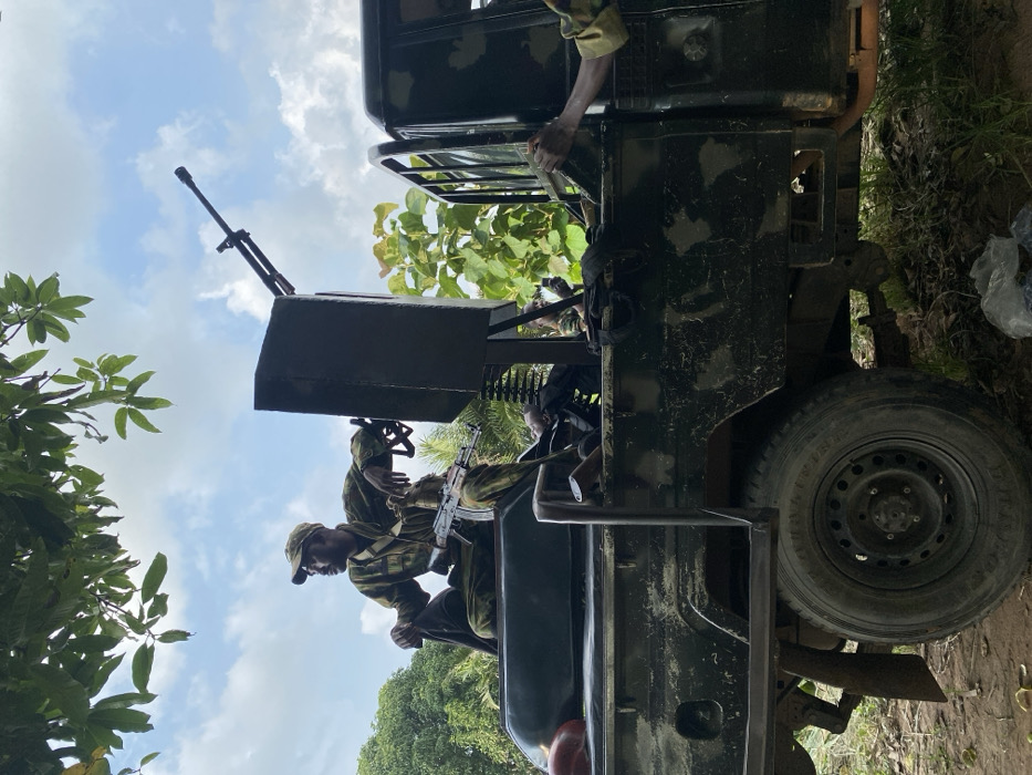 The image depicts a dark green utility truck, possibly a pickup, in a vegetated outdoor setting under a partly cloudy sky in Ayati, Nigeria. A male individual, wearing camouflage fatigues and a cap, is seated on the roof of the truck's cab, holding an AK-variant assault rifle across his lap, looking to the viewer's left. A heavy machine gun, mounted on a custom dark grey platform, is positioned in the truck bed, pointing upwards and to the right. At least two additional individuals, also in camouflage, are partially visible within the truck bed; one's right arm extends towards the truck's side railing, while another's head is visible behind the weapon mount. The truck's body is soiled, and a red object is present in the rear of the bed. Dense green foliage, including overhanging tree branches, frames the scene. The ground beneath the vehicle is unpaved and scattered with leaves, and a white plastic bag containing dark contents lies near the bottom right.