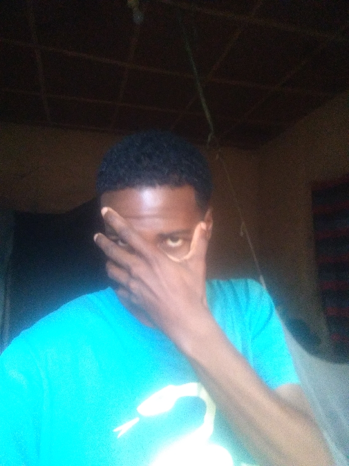 A young man with short, dark hair partially obscures his face with his hand. A single eye is visible, looking directly at the camera. He wears a bright turquoise T-shirt featuring a light-colored snake design. The background appears to be an interior space with dark wooden beams on the ceiling. A partially visible striped curtain adds to the cluttered feel of the room.