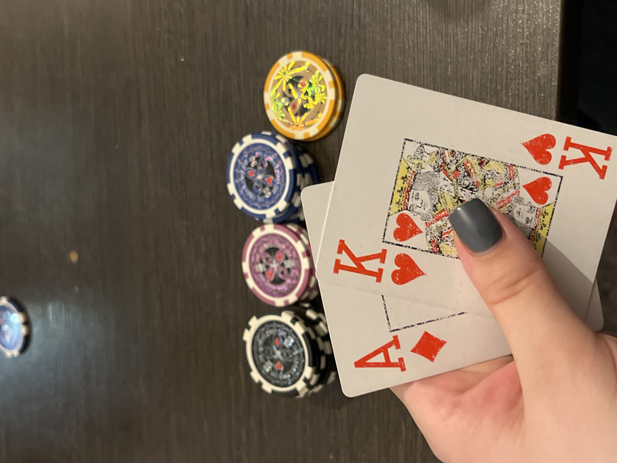 hand holding two playing cards, an Ace of Diamonds and a King of Hearts, next to a stack of poker chips
