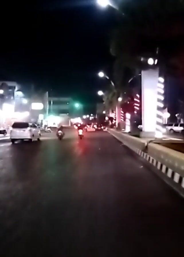 The video depicts a street scene at night. Several vehicles, including cars and motorcycles, are visible on the wet asphalt road. Streetlights illuminate the area, and buildings line the sides of the road. One building is decorated with vertical stripes of red and white lights. A white curb separates the road from a sidewalk area with trees. The traffic signal ahead is green. The video is somewhat shaky.