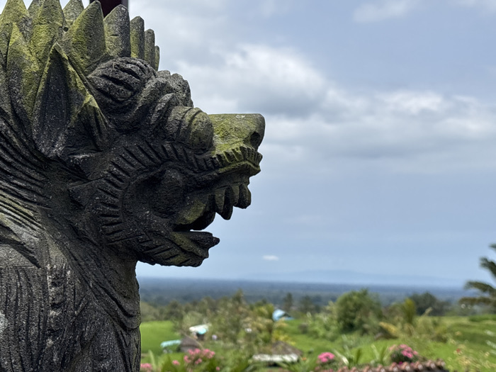 The image displays a weathered, dark gray stone statue of a mythical creature, likely a Naga or Singa, occupying the left side of the frame, positioned on an elevated viewpoint in Unknown, Indonesia