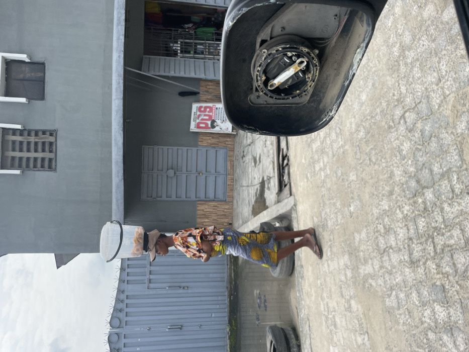 An image captured in Langbasa, Nigeria, displays an urban street scene on an overcast day, viewed from a vehicle