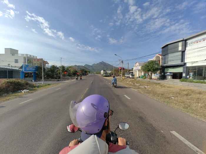 The image depicts a first-person perspective from the rear of a motorcycle traveling forward on a paved two-lane road in Tuy Phong 4, Vietnam