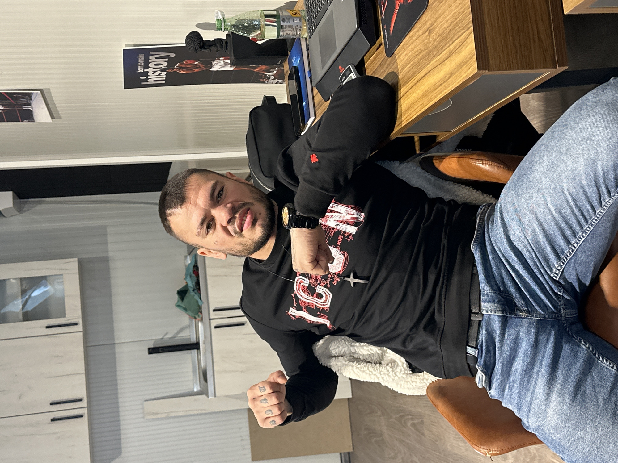 A man with short, dark hair and a beard sits at a wooden desk. He wears a black hoodie with a red and white design, blue jeans, and a gold watch. He is seated in a brown leather chair. His fists are clenched, and he appears to be making a gesture towards the viewer. A laptop, mouse pad, water bottle, and book are visible on the desk. The background shows a white wall, cabinets with black handles, and a poster. The location is in a room. There is no explicit information indicating the location is in Mramor, Bulgaria.