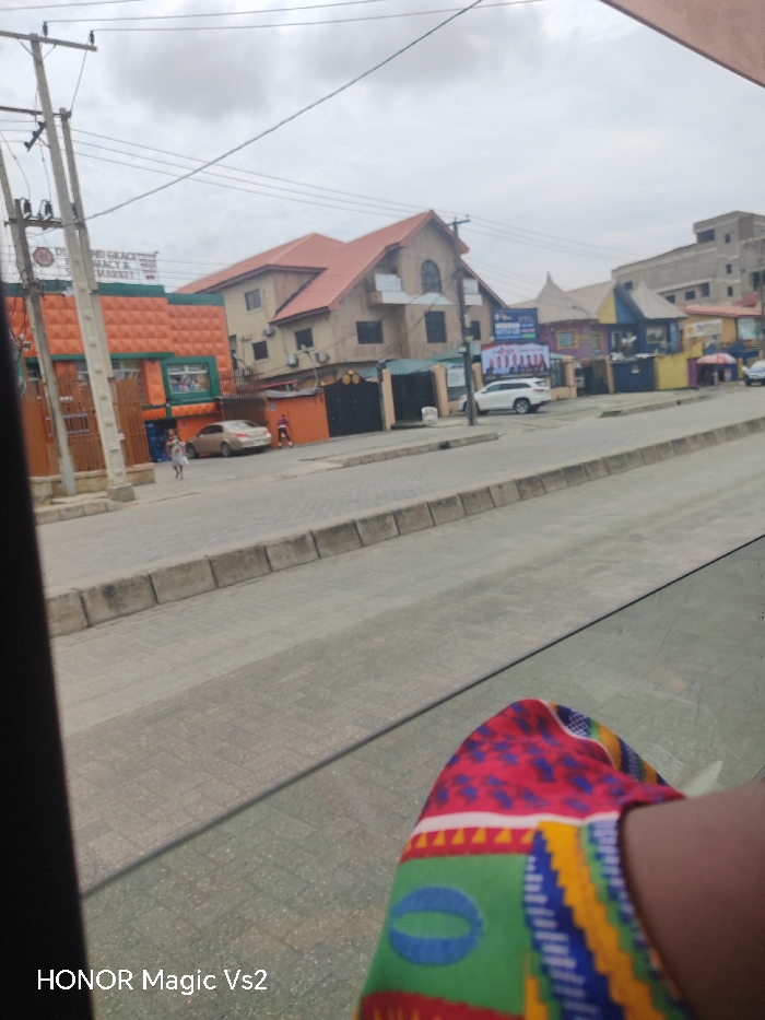 The image depicts a street scene in Ijegun, Ikotun-Idimu Road, Lagos, Nigeria, captured from inside a vehicle under an overcast sky. In the lower right foreground, a person's leg or arm is partially covered by colorful patterned fabric. A digital watermark "HONOR Magic Vs2" appears in the lower left. The street features a grey paved road, with a low concrete median separating areas. On the left, a paved sidewalk runs alongside buildings. The closest building is a two-story commercial structure with an orange, textured facade on its lower level, displaying a sign that reads "DIVINE GRACE PHARMACY & SUPERMARKET." A gold-colored sedan is parked on the sidewalk in front of this building. Two individuals are present near the sedan: one person in light clothing walks leftward on the sidewalk, and another in darker attire stands near the vehicle. Utility poles with multiple overhead power lines line the left side of the street. Further down the street, to the right of the orange building, a larger, beige multi-story building with a red-tiled roof, an arched window, and a small balcony is visible. Beyond this, a series of smaller, brightly colored commercial buildings (blue, yellow, pink) with varied rooflines, including one with a conical design, line the road. A white SUV is parked in front of these buildings, near a large banner depicting a group of people. In the far background, an unfinished grey concrete building stands. The environment reflects a bustling urban commercial area.