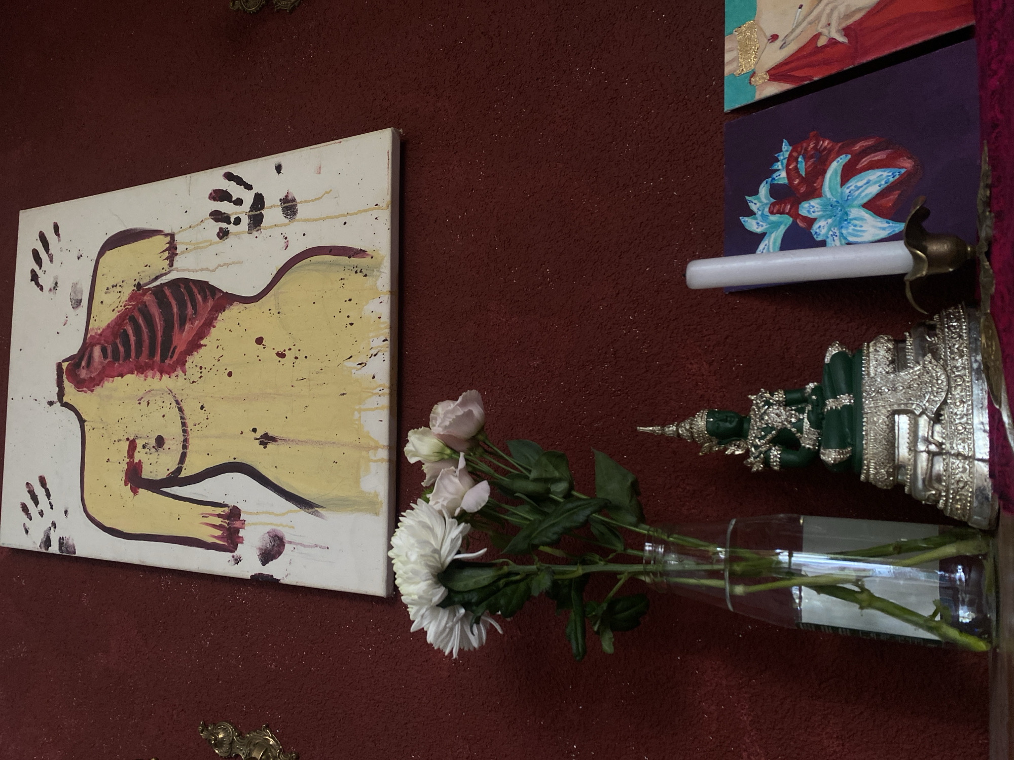 This image captures an indoor scene in Kunje, Montenegro, featuring a collection of art and decorative objects against a textured, dark red wall. Centrally located in the upper portion is a vertically oriented canvas painting. This painting depicts a stylized, headless, armless, and legless human torso rendered in yellow paint, with the left side exposing a red ribcage and internal organs. Red paint splatters and drips simulate blood, notably from the torso and limb stumps. Multiple dark handprints are present on the white background of the canvas. Below the painting, on a dark red draped surface, several items are arranged. On the left, a clear glass bottle, functioning as a vase, holds a bouquet of flowers comprising one large white chrysanthemum and several smaller, light pink roses. To the right of the vase sits a green Buddha statue in a meditative posture, adorned with a spired crown and intricate detailing, resting on an ornate, silver-colored tiered pedestal. Further to the right, an unlit white candle stands upright in a small, aged brass candle holder. Behind the candle and extending to the right are two small, upright rectangular canvases. The left canvas displays a red anatomical heart intertwined with blue lilies on a dark purple background. The right canvas, partially visible, depicts a figure in a red dress with a golden headdress and hands holding a cigarette, against a teal background. An ornate golden fixture is visible on the red wall to the left of the main painting.