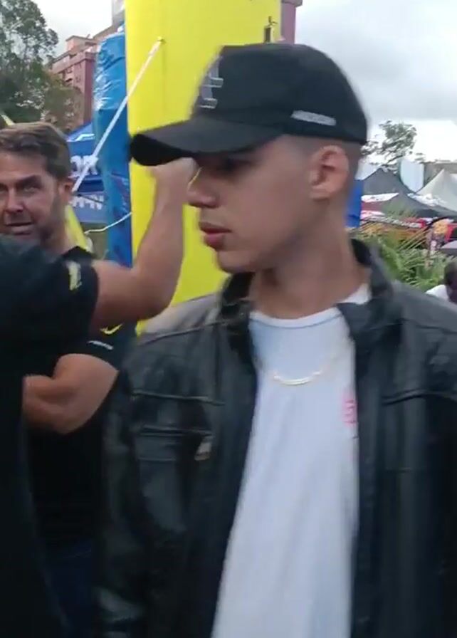 n outdoor event taking place on a cloudy day in what appears to be an urban setting. Several people are milling around a street area, with tents and promotional displays set up, suggesting a market or festival. There are individuals of varying ages and genders, dressed in casual attire. Some are seen talking to each other, while others are walking through the area. Several motorcycles are also visible, one being maneuvered through the crowd. A yellow inflatable pillar with black branding is prominent in the foreground. There are also buildings in the background, adding to the urban backdrop. The overall impression is a moderately crowded public event or gathering.