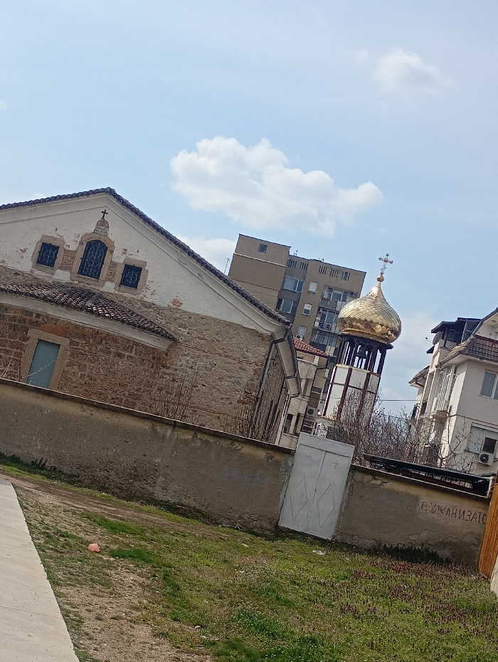 This image depicts an urban scene in Kazanlak, Bulgaria, under a clear light blue sky with scattered white cumulus clouds. The perspective is slightly tilted, looking upwards at a collection of buildings. In the immediate foreground on the left, a concrete sidewalk runs diagonally. Adjacent to it is a patch of uneven ground covered with sparse green grass, weeds, and bare earth, on which a small, crumpled pink object is visible. A weathered concrete wall, approximately waist-high, extends horizontally across the mid-ground. Embedded within this wall, slightly to the right of center, is a white double-leaf gate or door featuring embossed diamond shapes and a subtle cross symbol on its left leaf. To the right of this gate, the Cyrillic text "ВУЛКАНИЗАТО" (VULKANIZATO) is written or spray-painted on the wall. Behind the wall, bare branches of deciduous trees or bushes are visible. In the background, to the left, stands a building that appears to be part of a church. It features a stone foundation and a gable-ended upper section with an off-white plastered facade. The facade includes a central arched recess topped with a small cross, flanked by two square windows with dark, intricate grilles. Two more similar gridded windows are positioned below these. The roof is covered with terracotta tiles. A light blue door is visible on the side stone wall of this structure. To the right of the church building, a distinct, slender structure supports a prominent golden onion-shaped dome, which is surmounted by an Orthodox cross. Behind and to the right of this domed structure, several multi-story modern residential buildings with balconies are visible, indicating a denser urban setting. No individuals, specific actions, or direct interactions are visible within the frame. The scene presents a mix of traditional ecclesiastical architecture and contemporary urban development.