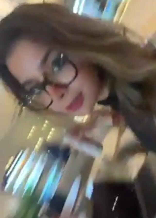 woman with brown hair and glasses filming in a bright cafe. The camera pans to show two other women at a table. One is eating a sandwich and the other is on her phone. The cafe has a modern decor with a wall of faux plants and a TV screen displaying menu items.
