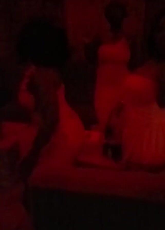 The video depicts four women inside a dimly lit nightclub. The foreground showcases three of them, partially obscured by a red couch. One woman on the left wears a red dress, while another on the right is in a white dress. A third woman is positioned between them, wearing a red top. The background reveals a fourth woman, standing near a wall and slightly shadowed. The nightclub is illuminated with blue and red lighting, creating a vibrant yet subdued ambiance.
