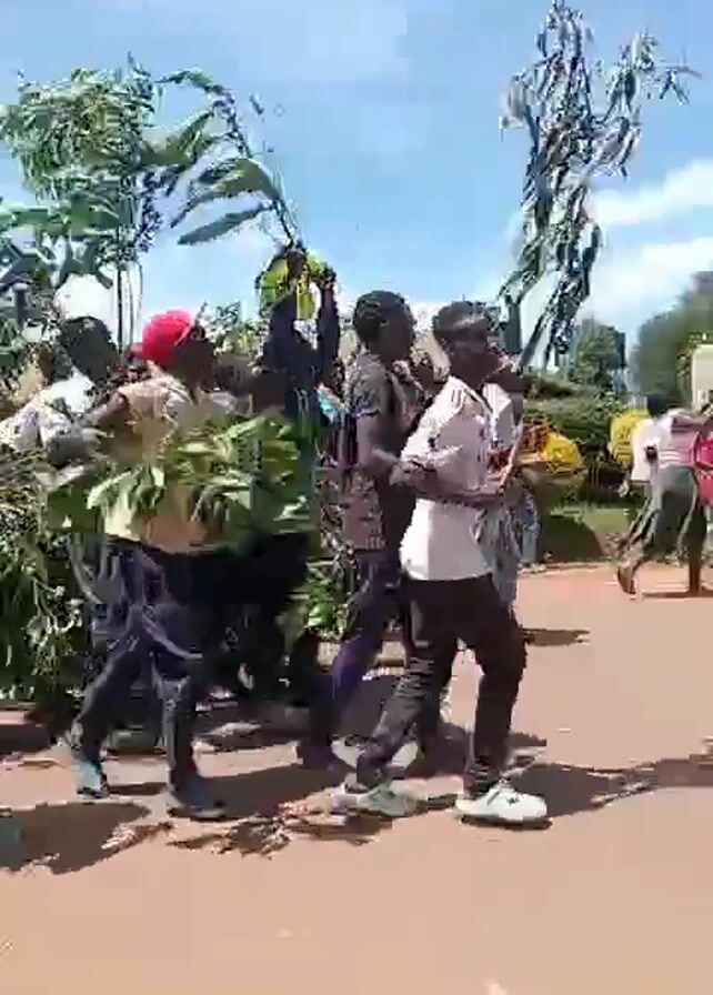 A group of people are walking down a street on a sunny day. Most of them are holding branches and leaves and some are carrying larger plants. There is a lot of cheering. Some people have their phones up to film. The street appears to be unpaved. There are trees in the background and a blue sky with some light clouds.
