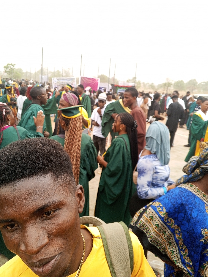 A graduation ceremony is underway. Many people are dressed in green gowns. Some wear graduation caps, and others wear head coverings. In the foreground, a young man in a yellow shirt and gold chain is looking at the camera. A woman in a blue patterned outfit is visible to the right. People in the background are milling around, with banners and poles set up further back. The sky is overcast.