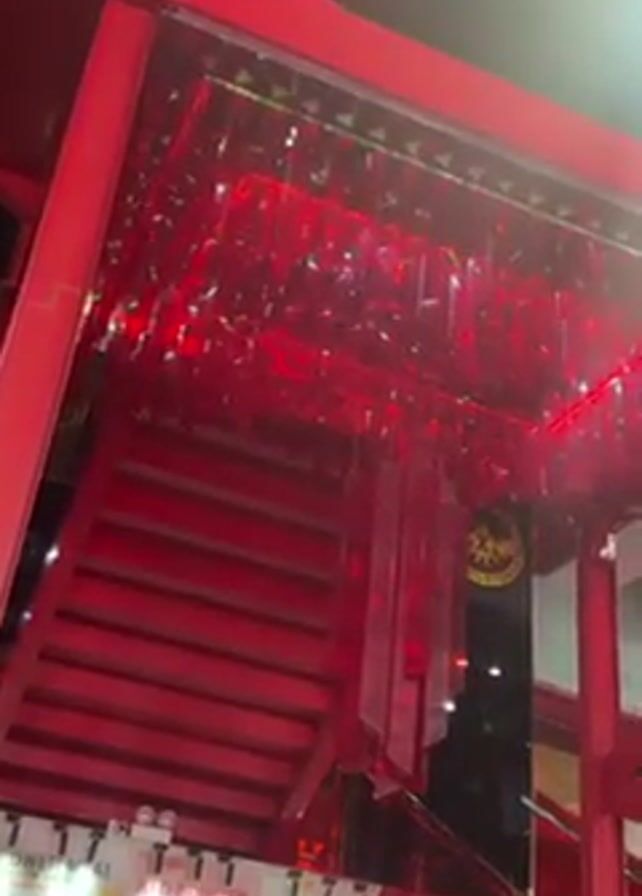 low-angle shot of an interior space featuring an intense red color scheme. A metal staircase with red steps and red support beams is prominent. Above the staircase, a decorative lighting fixture hangs, consisting of numerous rectangular shapes that reflect and amplify the red light. A logo, circular in shape with gold detailing on a dark background, is visible between the staircase and the hanging fixture. In the foreground, posters advertising various smoothie or juice flavors are partially visible. The overall environment suggests a modern, stylized interior, likely a commercial space such as a restaurant or bar. No people are clearly visible in the frame.