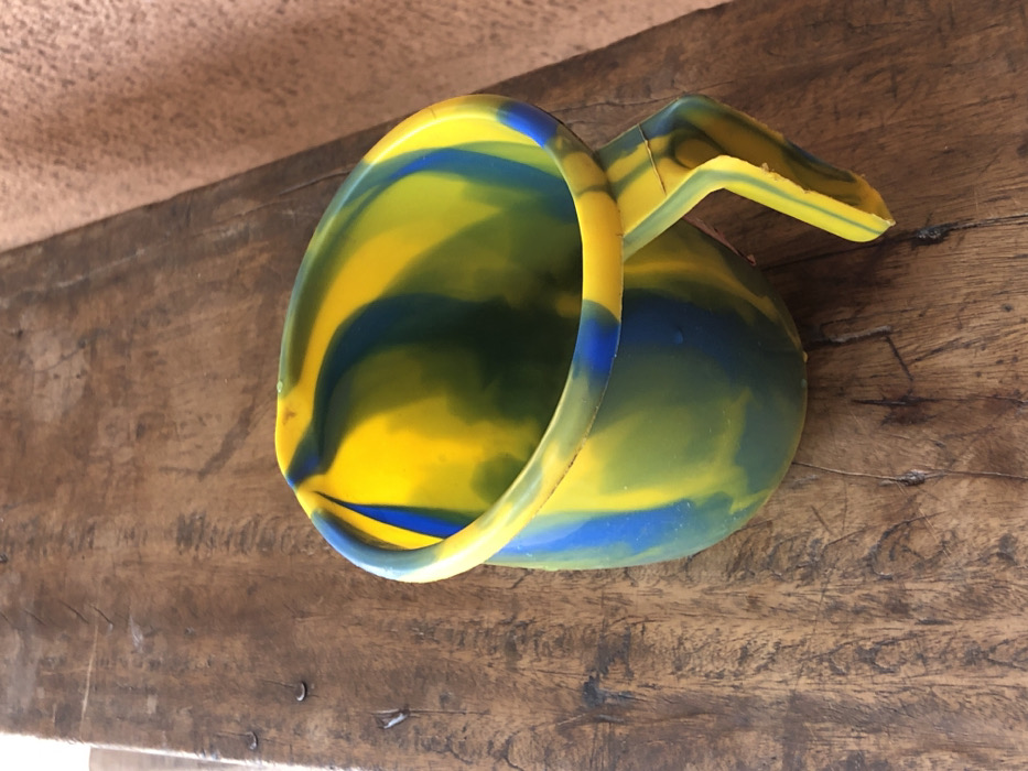 A yellow, blue, and green plastic scoop sits on a weathered wooden surface