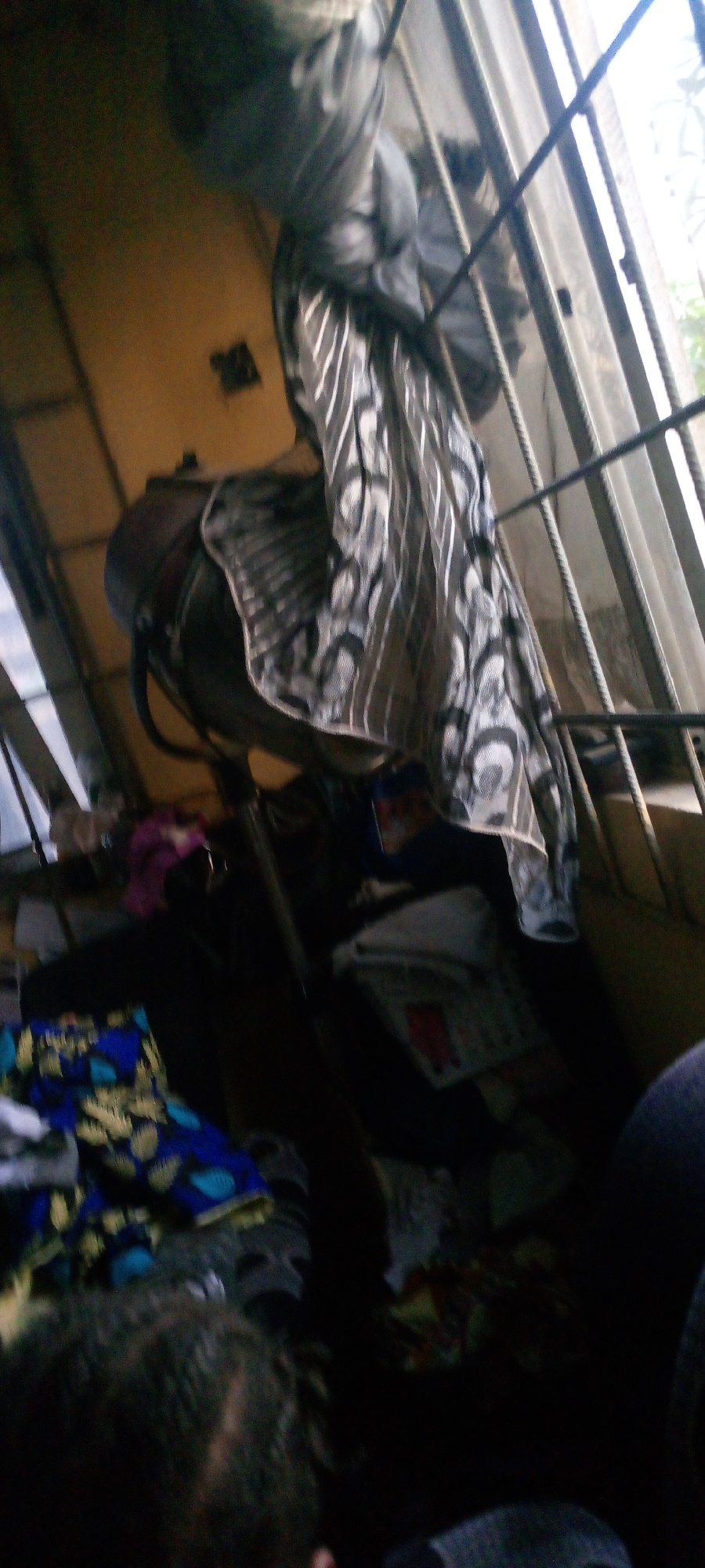 The image depicts an interior scene in Adankolo, Nigeria. A window, fitted with prominent vertical and horizontal metal security bars, is visible on the right side, allowing diffused daylight to enter. A patterned textile, featuring a light background with dark, organic or wavy motifs, is draped over the window bars. Below this textile and slightly to the left, a dark, rounded object, possibly an appliance, is partially discernible. The wall on the left appears to be a solid light brown or tan color. In the lower left foreground, the top of a human head, displaying dark, short hair, is visible. Adjacent to this and extending into the lower center, a collection of textiles is present, including a blue fabric patterned with yellow and teal shapes. The visible area suggests a cluttered indoor environment.