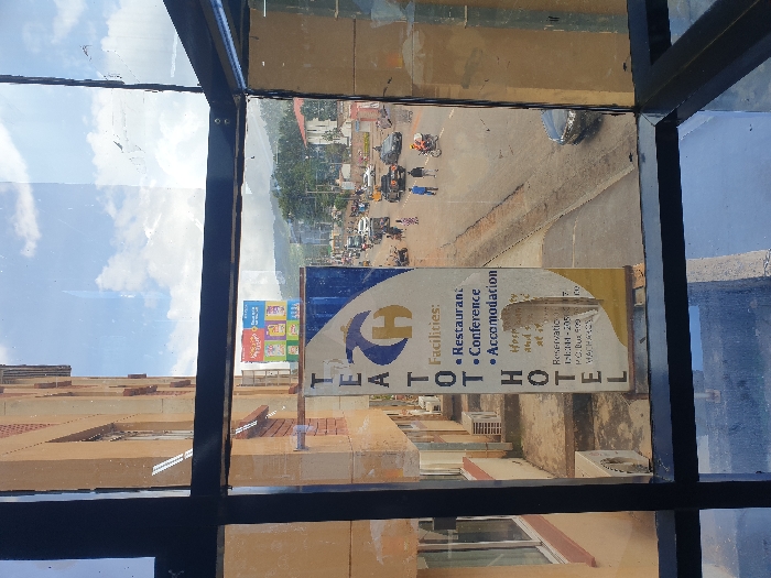 The image presents an eye-level view from an interior space, looking out through a multi-pane window. The dark, multi-sectional window frame significantly occupies the foreground, with visible dust and smudges on the glass. To the left, a segment of a light-colored, multi-story building with reddish-brown architectural accents is visible. Three exterior air conditioning units are mounted on its facade at varying heights. Centrally positioned, partially obscured by the window frame and the adjacent building, is a vertical white and blue banner. The banner prominently displays "TEATOT HOTEL" vertically down its left side, alongside a stylized gold logo. It lists "Facilities: • Restaurant • Conference • Accommodation" with a phone number for reservations and a P.O. Box 509 for "MACHAKOS" at the bottom. Beyond the banner and window, an active street scene unfolds in Machakos Central ward, Kenya. A paved asphalt road, showing some wear, is traversed by multiple vehicles including several sedans (one dark sedan is prominent in the immediate foreground of the street scene on the right), at least one white van, and approximately three motorcycles, two of which have riders. Pedestrians, numbering approximately five to seven individuals, are observed walking along the street and its periphery. Commercial buildings line the street. In the mid-distance, a large billboard displaying multiple colored square advertisements is visible. In the far background, a range of green hills or mountains rises under a sky characterized by scattered white clouds. The scene is illuminated by natural daylight.