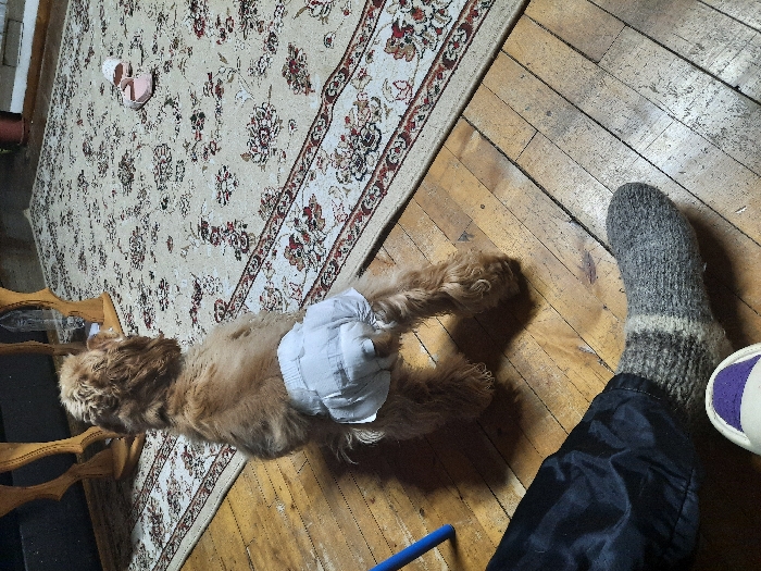 An indoor scene in Архангельское, Russia, depicts a light brown, long-haired dog, resembling a Cocker Spaniel, standing on a wooden floor with its back to the viewer. The dog is wearing a white disposable diaper around its hindquarters. A light-colored, ornate rug with floral and foliate patterns in red, brown, and green covers a portion of the wooden floor. In the foreground, a human's lower leg, clad in dark trousers and a grey knitted sock with a light stripe, is visible, with the toe of a white shoe with a purple accent at the bottom edge. In the background, a wooden table or furniture piece with a clear inverted plastic bottle (possibly a pet water dispenser) is visible on the left. Two light pink flip-flop sandals lie on the rug in the upper right, and a glimpse of a potted plant is seen in the far upper right corner. The wooden floor shows signs of wear.