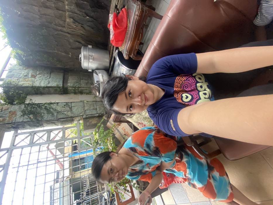 Two women pose for a rotated selfie. The woman on the top wears a navy blue shirt with a colorful design. The woman on the bottom wears glasses and a blue, orange, and white tie-dye shirt. Behind them, there's a gate, greenery, and a stone wall. To the right, there's a brown leather couch and a dark floor. A red bag sits on a wooden table, with metal containers behind it.