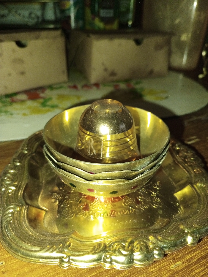 A close-up photograph taken indoors in Longmiang, Laos, displays a still life arrangement of brass-colored items on a wooden surface. A rectangular, ornate brass-colored tray with raised scalloped edges and embossed patterns forms the base. The inscription "MADE IN INDIA" is partially visible on its surface. Stacked centrally on the tray are three brass-colored bowls. The lowest visible bowl features small red and green circular accents on its exterior rim. Inverted within the uppermost bowl is a small, conical, brass-colored object, possibly a thimble or miniature cup. It exhibits multiple horizontal etched bands and a distinct, stylized emblem near its broader base. The background, out of focus, includes a patterned textile surface displaying red, yellow, and green elements, situated behind two light brown cardboard boxes with cut-out handles. Other indistinct items, potentially bottles, are also present. The lighting is warm and indirect, revealing minor dust accumulation on the metallic surfaces.