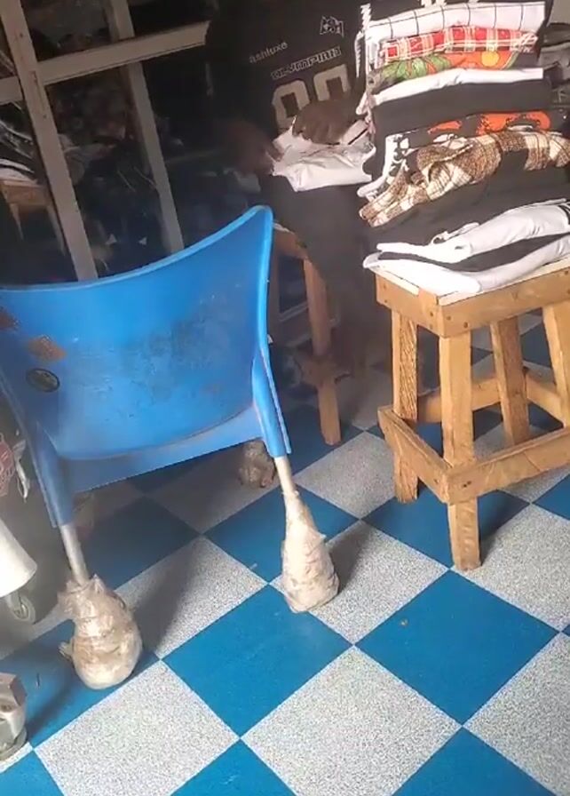 A young adult male is seated on a wooden stool in what appears to be a small clothing store