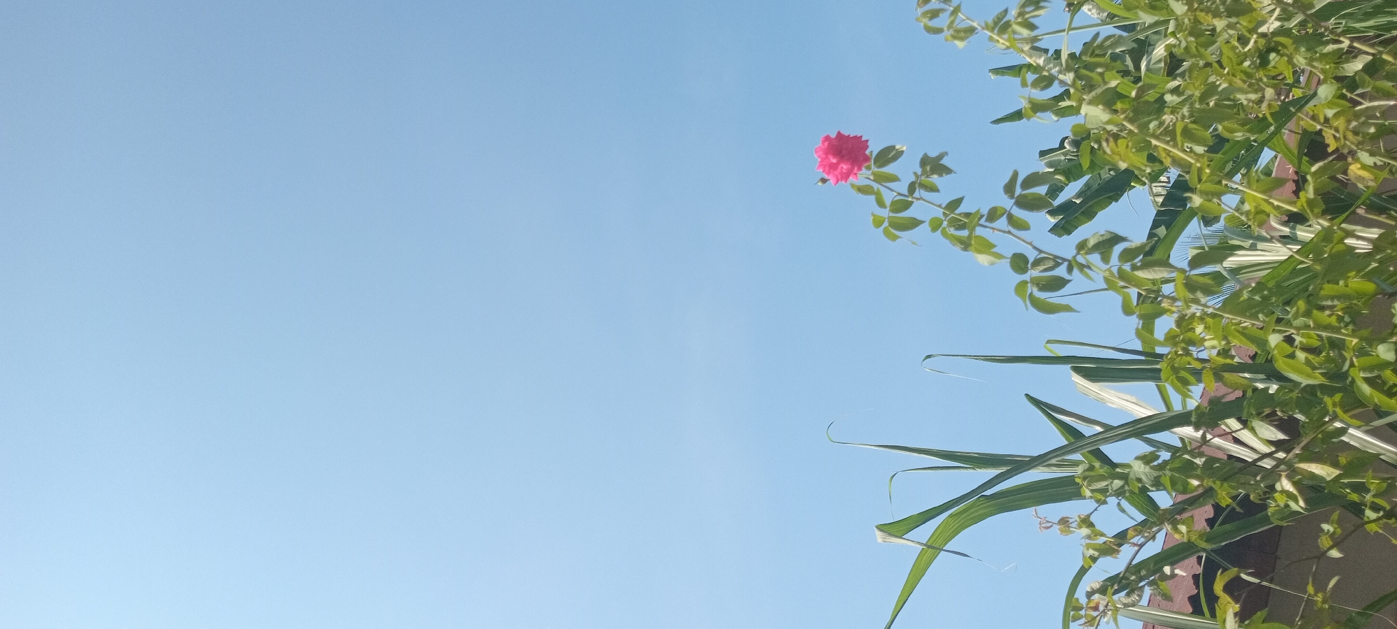 The image depicts an outdoor scene in Lhokseumawe, Indonesia, characterized by lush vegetation under a clear, light blue sky. Approximately the top two-thirds of the frame is dominated by the unobstructed sky, indicating bright daylight conditions. In the lower portion of the image, a variety of green plant foliage is visible. A single, vibrant pink rose bloom with fully opened petals is prominently featured in the upper right quadrant, growing on a thorny stem with multiple green leaves. To the left of the rose, and extending across the lower-left and central-lower areas, are several tall, upright green leaves, some exhibiting lighter green or whitish stripes, consistent with sugarcane or similar tall grasses. Beneath and intertwined with this foliage, a section of a reddish-brown tiled roof is partially visible, indicating the presence of a building structure. Further leafy green vegetation, including broader leaves, is present in the lower right, partially obscured by the other plants. No human subjects or discernible actions are present within the frame.