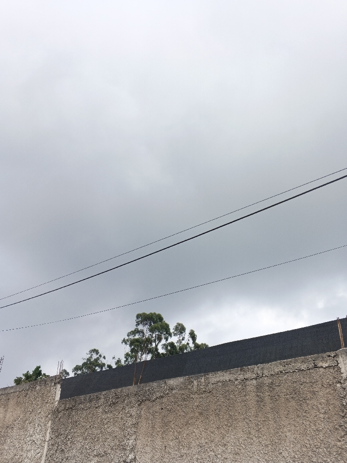 The scene is an exterior view in Koipa, Papua New Guinea, under a uniformly overcast, grey sky. Two taut, dark utility lines are suspended horizontally across the upper central portion of the frame. The lower foreground is dominated by a rough-textured, light-brown concrete wall. Exposed rebar rods protrude vertically from the concrete wall's uneven top edge at several points. A dark, solid barrier, likely corrugated metal or similar material, is affixed to the top of the concrete wall, extending its height horizontally across the frame. Beyond this constructed barrier, the green foliage of multiple trees is visible against the lower sky. No human subjects, animals, or observable actions are present.