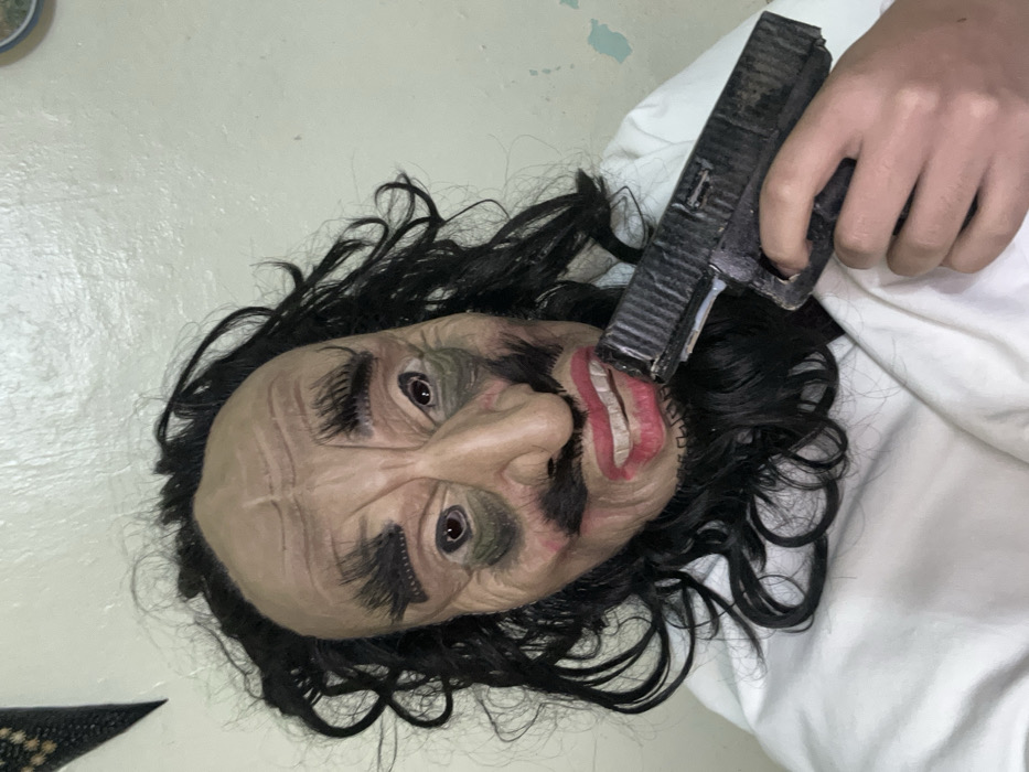 A disturbing image shows a mask of an elderly man with dark hair and a mustache, positioned as if lying on a white surface. A hand holding a toy gun is pressed against the mask's mouth. The mask's features are exaggerated, and the overall composition is unsettling and potentially alarming.