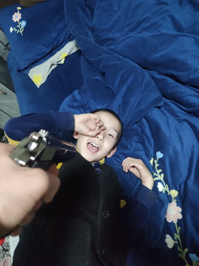 The scene is set indoors, likely a bedroom, in Rishtan, Uzbekistan. A young child, appearing male, is positioned supine on a bed covered with blue velvet-like bedding that features light blue, pink, and yellow floral embroidery. The child wears a dark blue long-sleeved shirt and a dark, possibly black, button-up vest. His eyes are wide open, and his mouth is agape, revealing teeth. His right hand is raised and covers part of his right eye. In the immediate foreground, an adult's hand, positioned from the viewer's perspective, firmly grips and aims a metallic, silver-colored object resembling a revolver directly towards the child's upper body. The object features a visible hammer and cylinder. A crumpled grey fabric with yellow star-like patterns is partially visible beneath the blue bedding near a blue pillow with matching floral embroidery. The overall lighting suggests an indoor artificial light source.