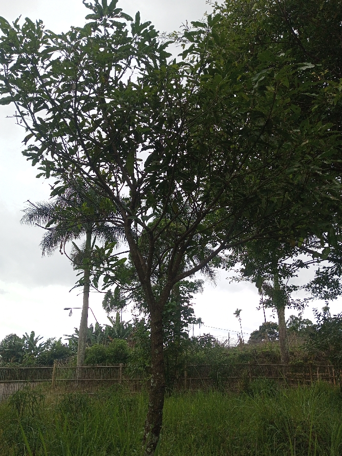 Lush greenery dominates the scene. Tall grass fills the foreground, leading to a medium-height bamboo fence. Behind the fence, a thicket of various trees and plants rises, including banana trees and palms. Two prominent trees stand in the foreground, their branches heavy with foliage. A cloudy sky provides a muted backdrop to the vibrant green landscape. A street light pole is visible amidst the foliage.