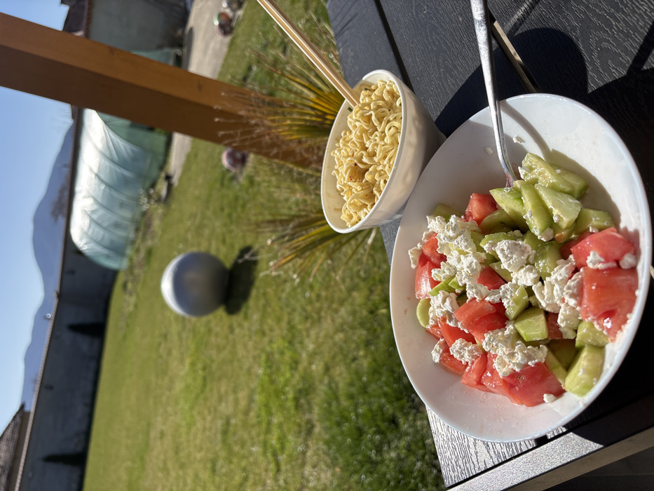 The scene is an outdoor setting in Dabene, Bulgaria, captured under bright daylight. In the immediate foreground, a dark, textured table surface displays two white bowls. The left bowl contains a chopped salad composed of red tomato pieces and green cucumber slices, liberally topped with crumbled white cheese; a silver fork rests within the contents. To the right, a smaller white bowl holds dry, wavy instant noodles, with a pair of light-colored chopsticks inserted upright. Strong sunlight casts distinct shadows across the table. The midground features a vibrant green lawn with short-cut grass. A large, matte grey spherical object is centrally positioned on the lawn, casting a shadow. Further right, multiple smaller, multi-colored spherical garden decorations are partially visible. A low, light-colored masonry wall spans the width of the upper midground, partially fronted by several dark, conical evergreen shrubs. Behind this wall, a translucent green, tunnel-shaped structure, consistent with a poly-tunnel or greenhouse, is visible. The background consists of distant mountains under a clear, bright blue sky. The mountain peaks exhibit patches of white, indicating snow. A vertical wooden support beam of an outdoor structure is prominent on the right side of the frame. No individuals are present in the image.