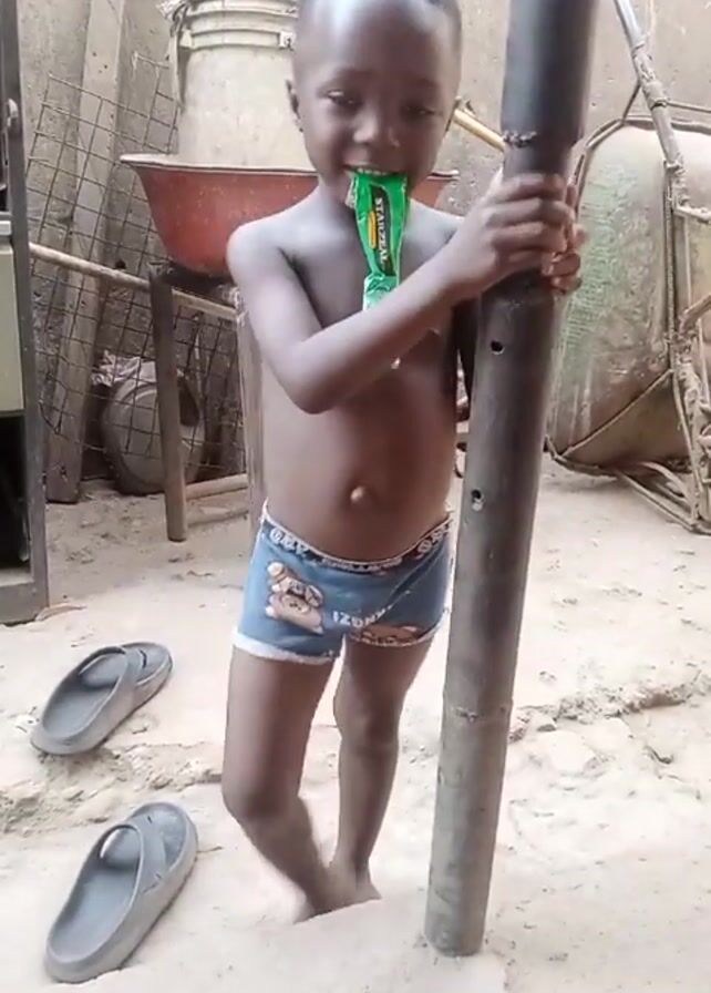 A small child, who appears to be a boy, is standing in a sandy area in a backyard or patio. He is wearing only blue and white patterned boxer shorts. He has a green and white package in his mouth. He is holding onto a tall, dark metal pole with both hands. The pole is standing upright in the sand. Behind the child, there are various objects including a metal bowl, a wooden stool, a metal cage, and a large tank. A pair of gray sandals sit on the sand next to the child. The child seems to be playfully holding onto the pole.
