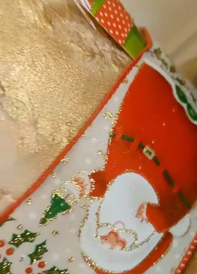 The camera focuses on a gold painted object, likely a jar or container, decorated with a Christmas-themed ribbon. The ribbon is white with images of Santa Claus, holly leaves, and snowflakes. The top of the object appears to be textured with a gold paint or coating. The camera slowly pans around the object, showing the ribbon and gold surface from different angles.