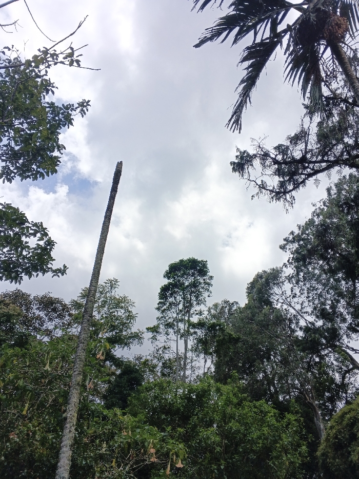 The image depicts an upward view into a dense tree canopy against an overcast sky in La Castellana, Philippines. The sky displays a mix of white and gray clouds, with a small patch of blue visible on the upper left. A prominent, slender, debarked tree trunk, dark gray-brown and broken at its top, ascends vertically from the lower left quadrant towards the image center. Lush green foliage from various broadleaf trees and shrubs fills the lower two-thirds of the frame. Several light brown, trumpet-shaped flowers are visible hanging from branches in the lower-mid ground, adjacent to the central vertical trunk. In the upper right corner, the dark green fronds and upper trunk of a palm tree are partially visible. The scene is unpopulated, showcasing a verdant, natural environment.
