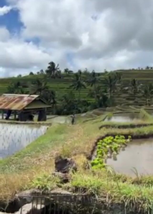 lush, tiered rice paddy landscape under a partly cloudy sky. In the foreground, a small, weathered wooden structure sits beside a flooded paddy field. Further back, a person walks along a narrow grassy path between the paddies, carrying a large, light-colored object on their shoulder and a stick in their hand. The person is wearing a hat, a light-colored shirt, and shorts. The tiered rice paddies extend up the hillside, interspersed with trees, primarily coconut palms. The paddies are filled with water, some with visible rows of young green plants. The overall environment appears to be a rural agricultural area.