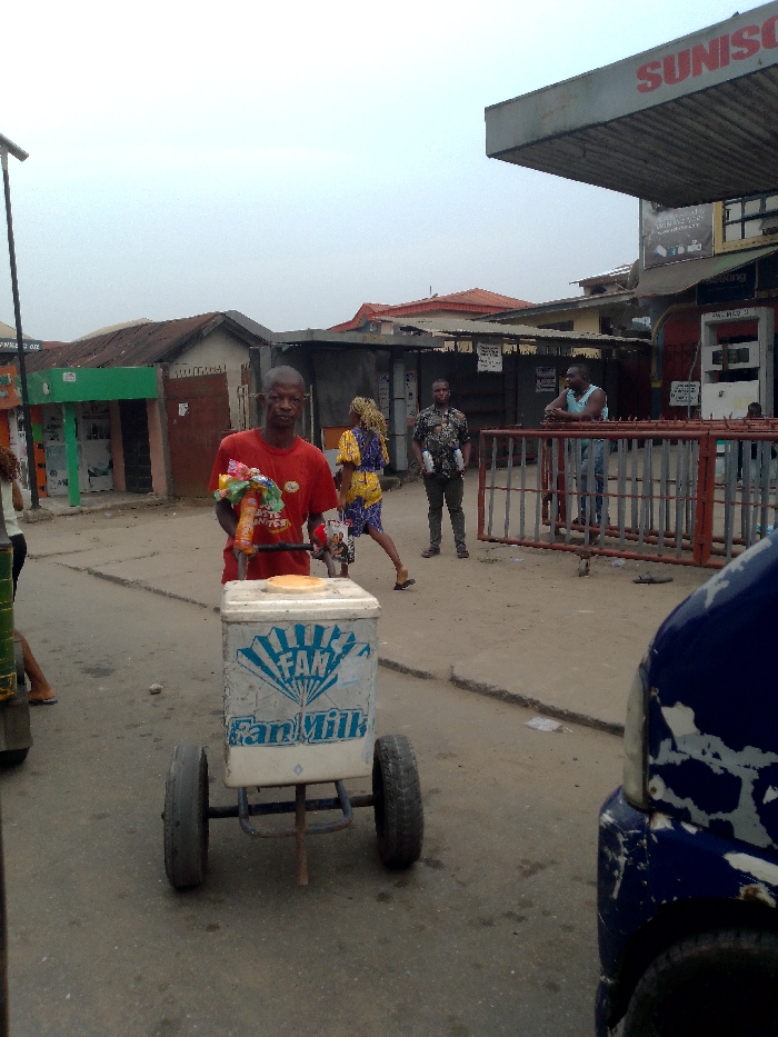 A man in a red t-shirt pulls a cart with "Fan Milk" written on it. He's holding a bunch of colorful items. In the background, a woman in a yellow and blue dress walks by, followed by a man in a patterned shirt. Another man leans against a metal barrier near a "SUNISO" gas station. The scene appears to be a bustling street in a town, with various shops and buildings lining the road. A blue vehicle's front is partially visible on the right side.