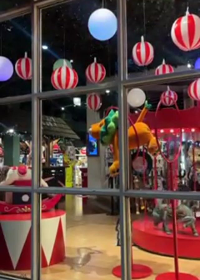 A view through a large glass window reveals a Christmas-themed interior, predominantly red and white. Red and white striped ornaments and colored globes hang from the ceiling. Displayed are a rocking horse, toy carousel with stuffed animals, and a drum. A dog is briefly visible at the bottom of the frame, near the window.