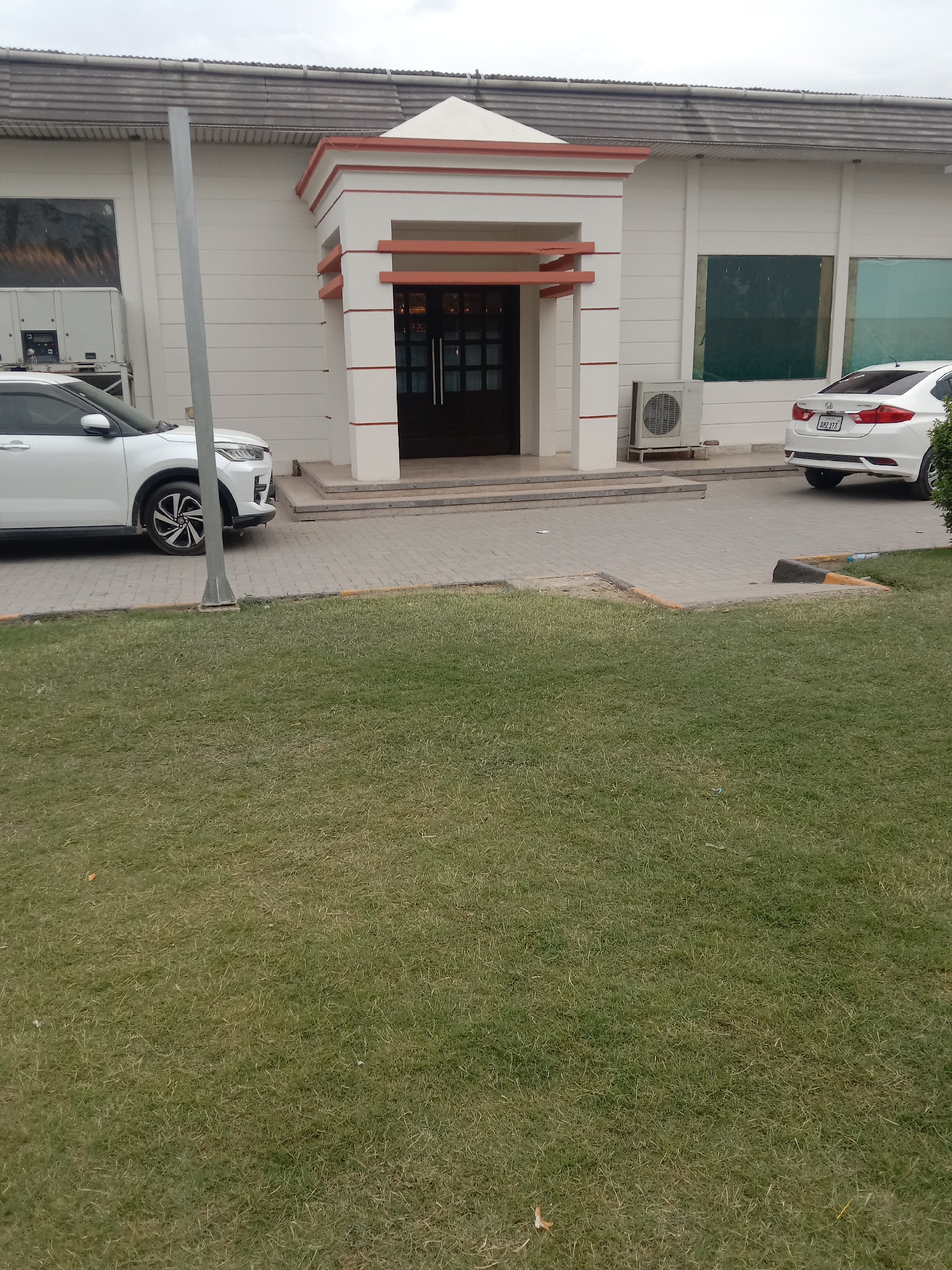 An exterior view in Kot Bhattian, Pakistan, depicts the entrance of a light-colored building under an overcast sky