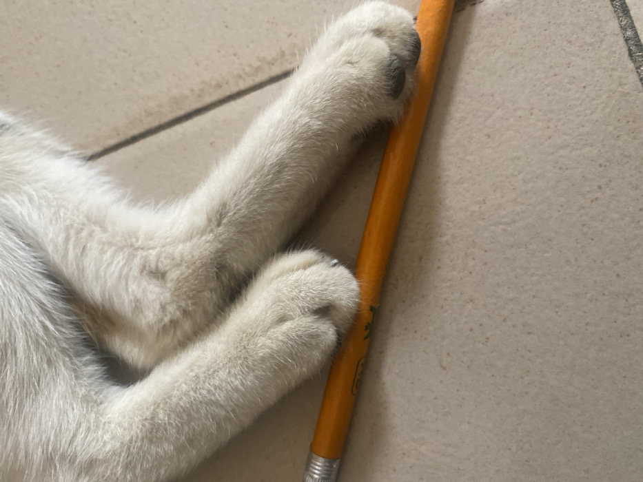 The scene is situated within an unspecified indoor environment in Katcha, Nigeria. The image captures the lower torso and front limbs of a light-furred animal, consistent with a domestic feline, resting on a tiled floor. The animal's fur is predominantly white or very light beige. A single orange-colored wooden pencil lies horizontally across the lower central portion of the frame. This pencil features a silver-colored metal ferrule on its left end and a subtle green graphic mark on its barrel. The animal's two front paws are observed resting directly on the orange pencil; the left paw is positioned closer to the pencil's ferrule, while the right paw rests further along the pencil's shaft towards the right. Dark paw pads are visible on both front paws. The background consists of light beige or tan ceramic floor tiles with darker grout lines forming a grid pattern. No individuals are present in the frame.