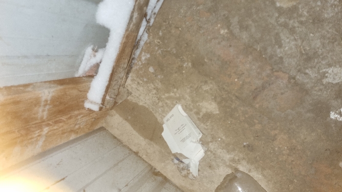 An upward angled view shows a dilapidated space, possibly an attic or basement. Exposed wood beams are visible, some with snow accumulation. The floor is a rough, stained concrete. A torn, partially obscured piece of white paper or cardboard lies on the floor, potentially with printed text. The overall impression is one of disrepair and neglect.