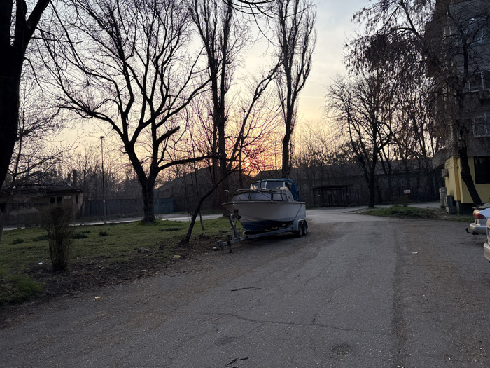 The image displays a static outdoor urban scene in Vidin, Bulgaria, captured during either dawn or dusk. The sky exhibits a gradient of color, transitioning from a warm orange-pink at the horizon to a pale blue overhead, with the sun's low angle illuminating the environment. Numerous bare deciduous trees with visible branches are scattered throughout the frame, their silhouettes prominent against the sky. In the foreground, an asphalt surface with visible cracks and minor debris extends towards the midground. Adjacent to the asphalt on the left is a patch of uneven, sparsely vegetated ground containing a small, dark green bush. The central subject is a white motorboat, equipped with a blue canvas cover, resting on a silver tandem-axle boat trailer. The boat and trailer are parked on the asphalt, oriented slightly towards the left of the frame. To the immediate right of the boat, a portion of a dark-colored sedan is visible. In the midground-left, a small, single-story building with a light-colored facade is partially visible behind the foliage, bearing Cyrillic text, "ТЕРЕКИН," on its side. A dark fence, possibly chain-link, extends horizontally across the background, separating the midground from a densely vegetated area or additional trees. On the far right, a section of a multi-story apartment building constructed from concrete, featuring yellow-painted elements on its lower facade, is visible. No individuals are present in the scene, and no actions or interactions are depicted.